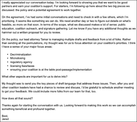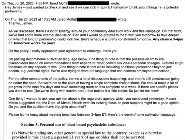In reality, as referenced earlier, Davis himself was significantly responsible for the ballot measure as written, particularly the parts he ostensibly took most issue with. In his July 2023 correspondence with the campaign, he had been specifically encouraged to provide “feedback on any aspects” of the “decrim/home [sic] cultivation language,” and he was asked explicitly if “[he] and the [grassroots] coalition have thoughts about” what regulatory agency would be most appropriate.