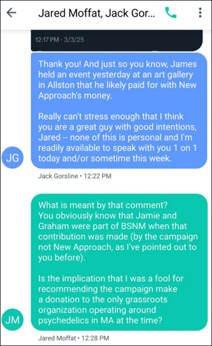In the same group chat, Moffat also invoked Morey’s and my involvement with Bay Staters for Natural Medicine as volunteers in 2023 as validation of his decision. This brushed over the fact that Morey and I—in addition to having only known Davis for less than a year and having been similarly unaware as Moffat about Davis’s true inclinations at the time—had not been involved with soliciting the donation and, unlike Moffat, had not been professionally responsible for assessing Bay Staters for Natural Medicine as a partner. Alluding to this discrepancy, Gorsline swiftly retorted: