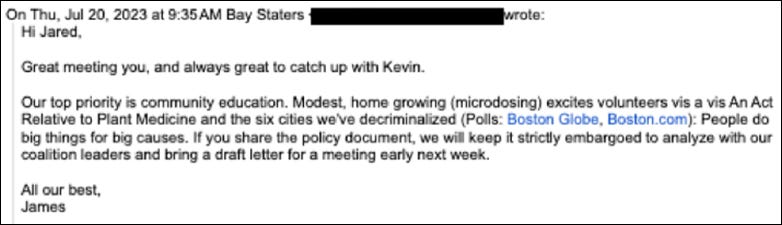 Rather than replying with substantive policy feedback, Davis had answered “our top priority is community education. Modest, home growing (microdosing) excites volunteers vis a vis An Act Relative to Plant Medicine and the six cities we’ve decriminalized.”